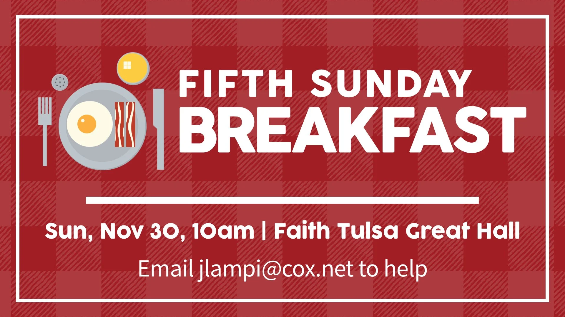 Join us between services at Faith Tulsa for a time of fellowship in the Great Hall at our Fifth Sunday Breakfast. If you are available to help setup, cook, or cleanup, please contact Janie Lampi.