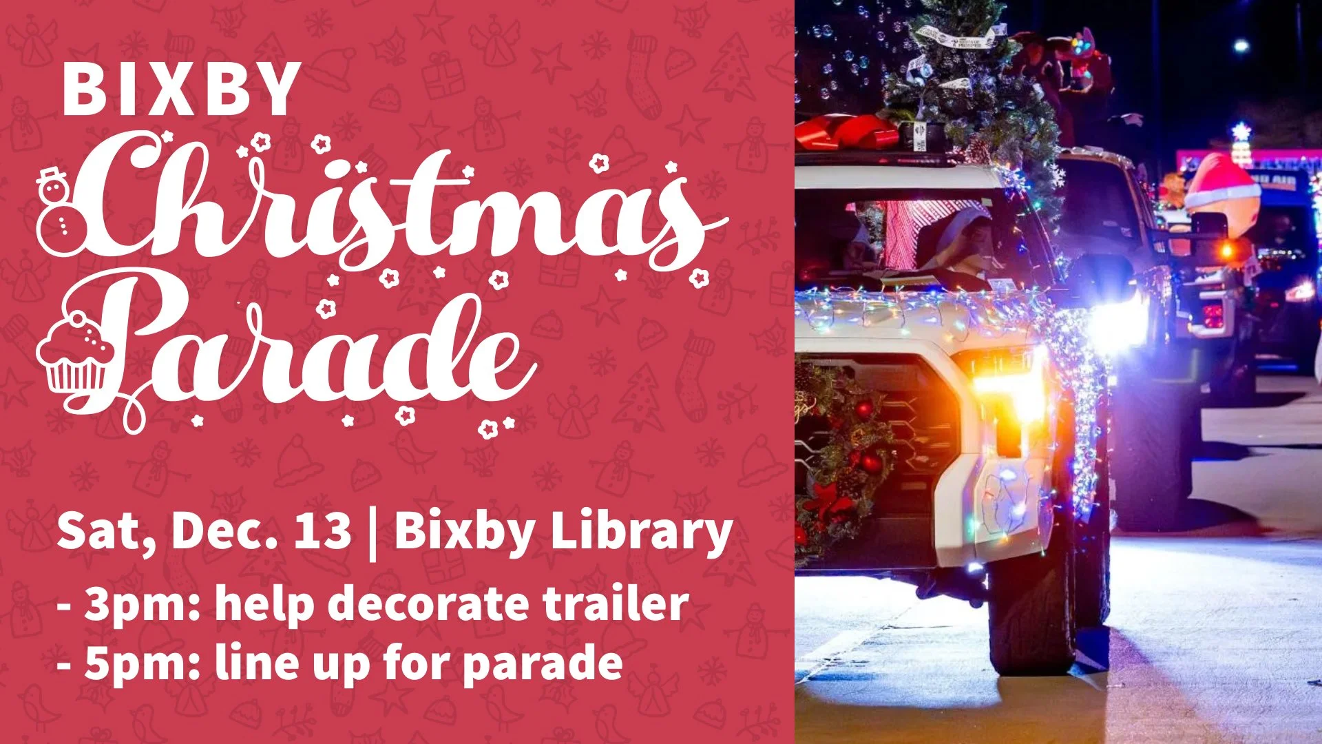 Saturday, December 13 | 3pm for decorating, 5pm for parade | Bixby Library